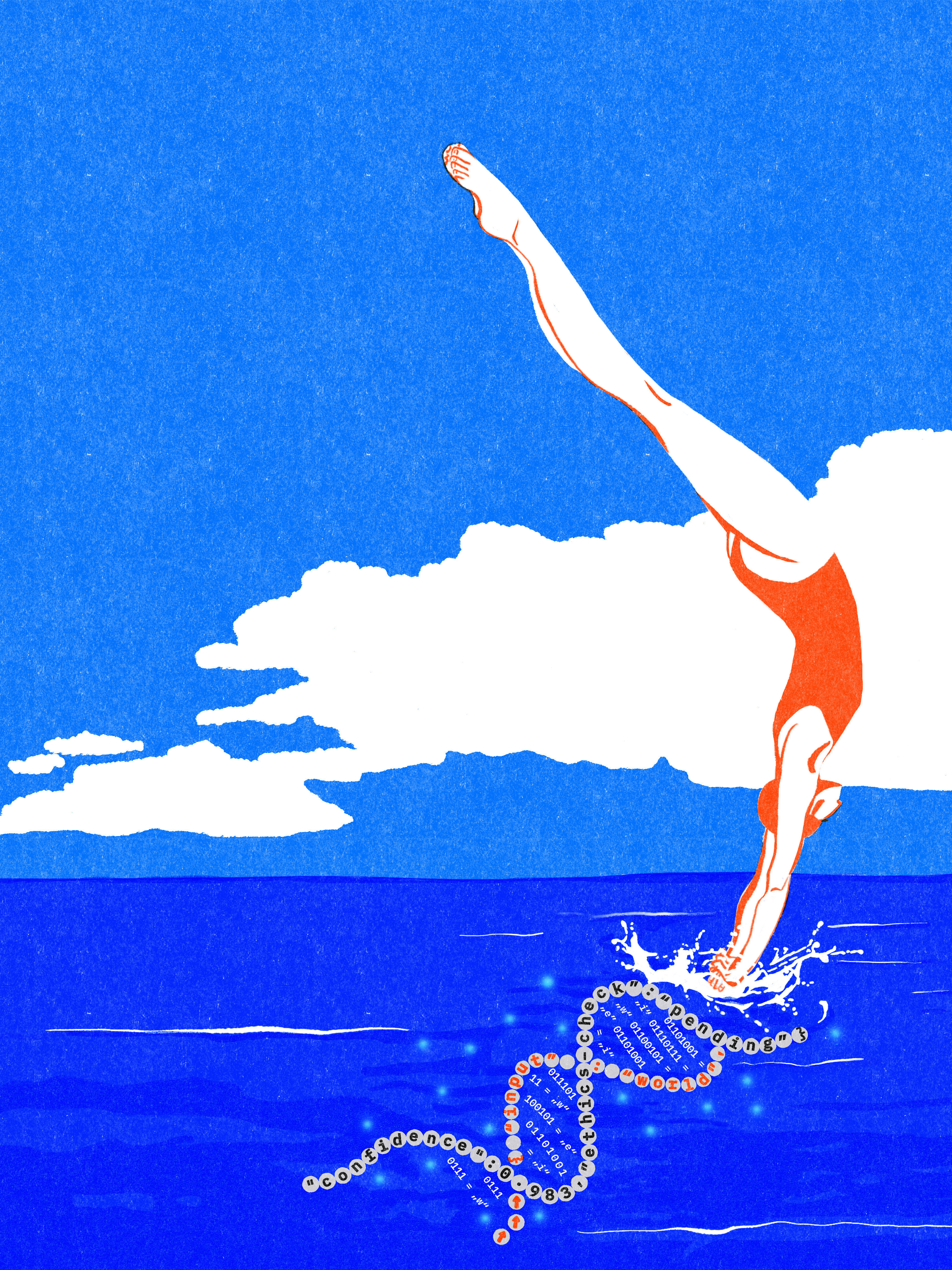 A diver — strong, graceful, focused — pierces the surface of a deep blue unknown, heading straight into a glowing strand of symbolic DNA. Letters, data, language — our digital essence.