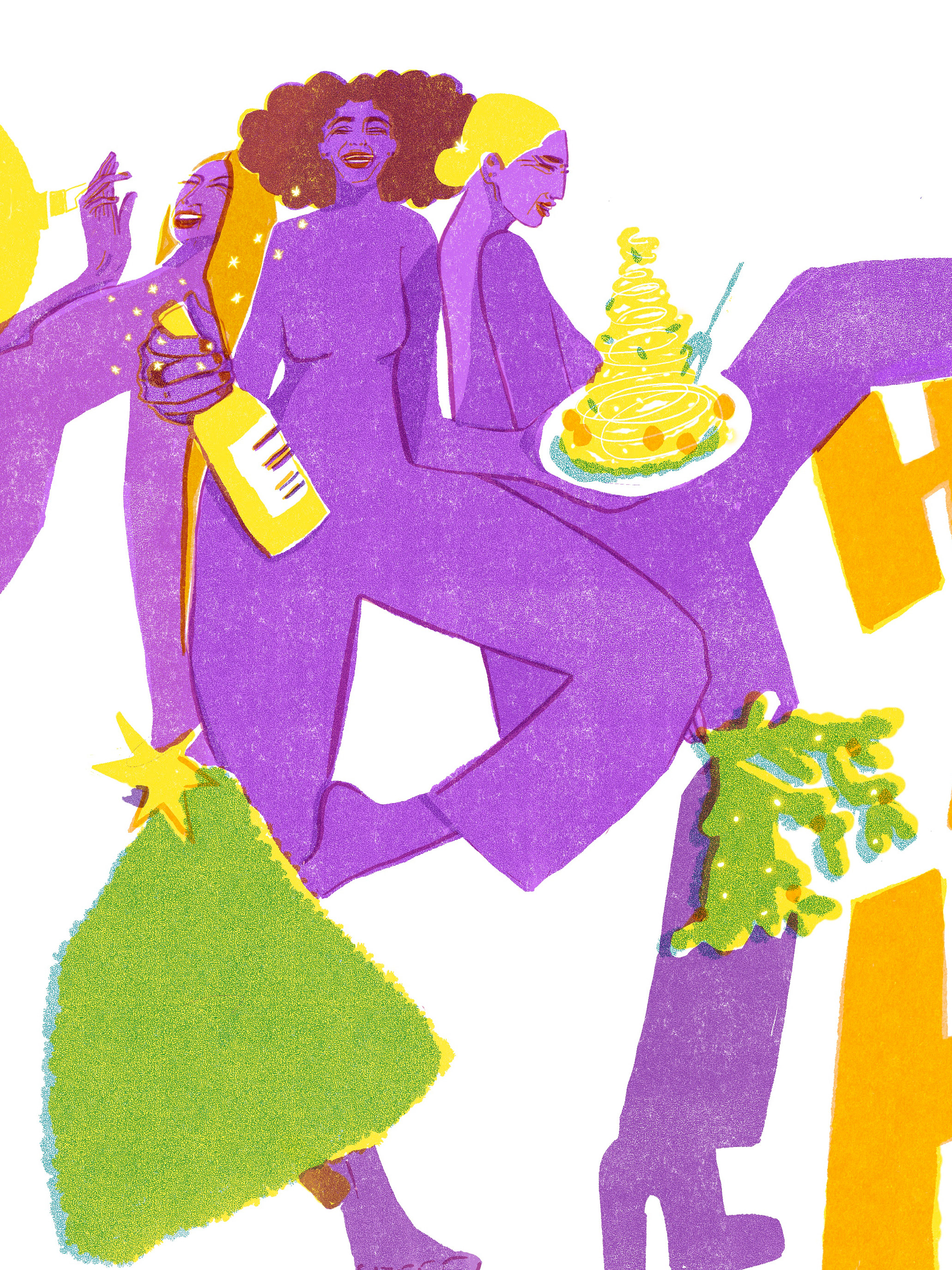 A festive illustration series capturing the unfiltered energy of the holidays. Featuring bold, high-kicking characters, saturated color palettes (purple & yellow), and two animated GIFs distilling the chaotic fun.