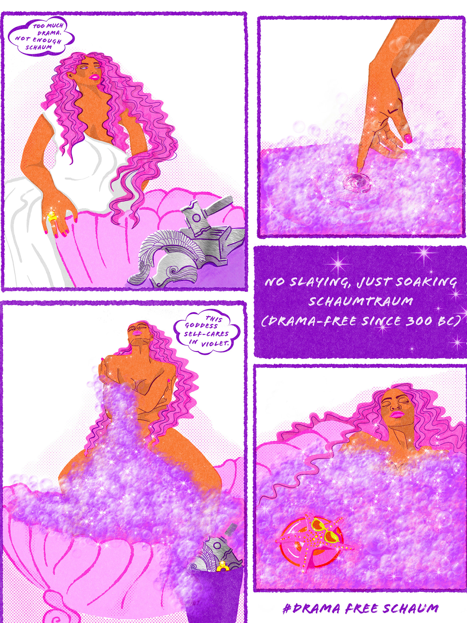 Here, Aphrodite takes the spotlight: instead of engaging with the drama of her partners Ares and Hephaistos, she chooses self-care and a violet foam bath. At the center, I placed the Goddess bath bomb by LUSH – a symbol of relaxation, empowerment, and reimagining mythology in a contemporary way.