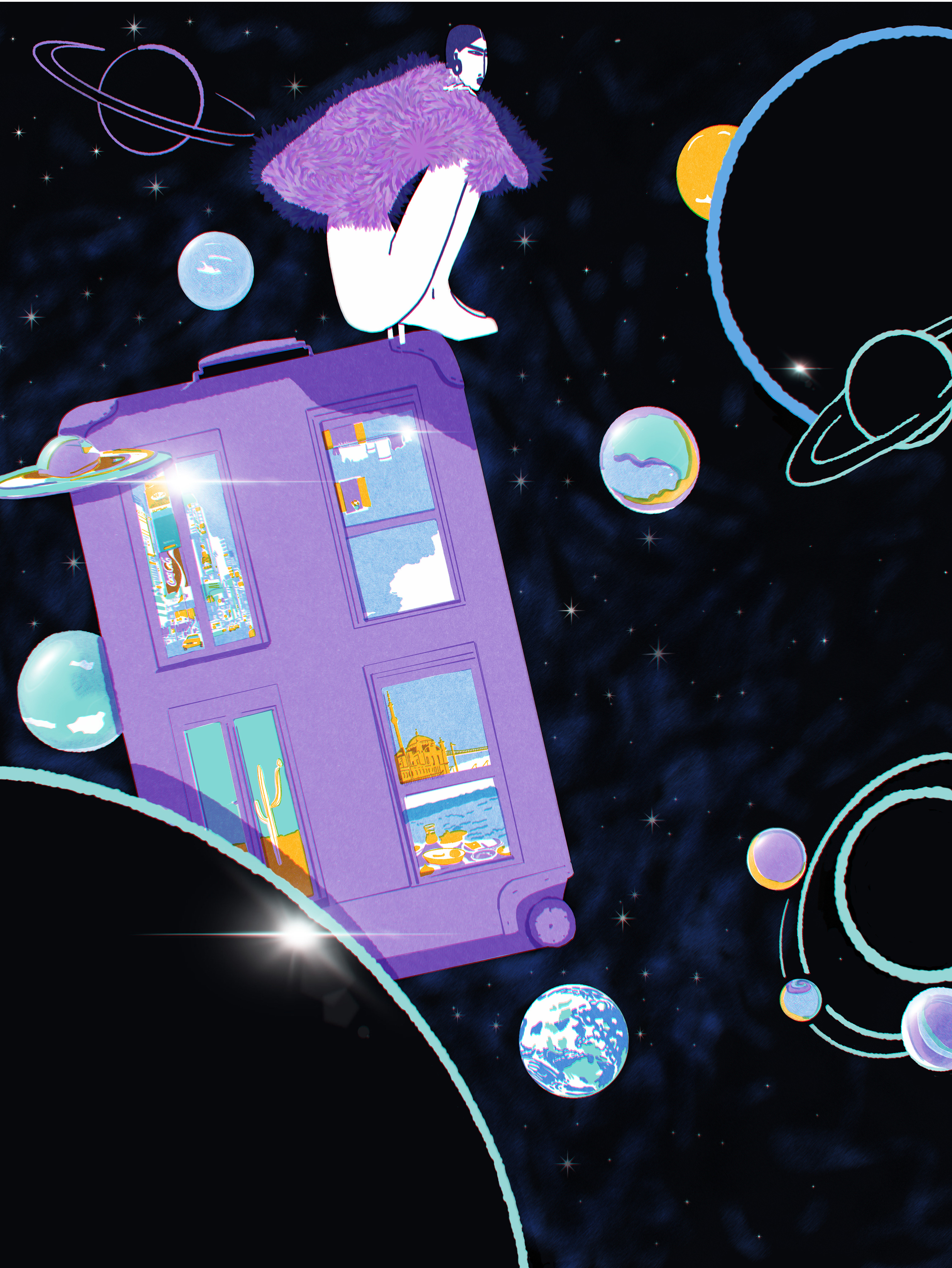 A digital illustration exploring intellectual nomadism, inspired by Kenneth White’s writings. A figure travels through a cosmic, imagined space, carried by a suitcase that functions as both vehicle and interior. Windows reveal fragments of places, memories, and possible lives, existing simultaneously.