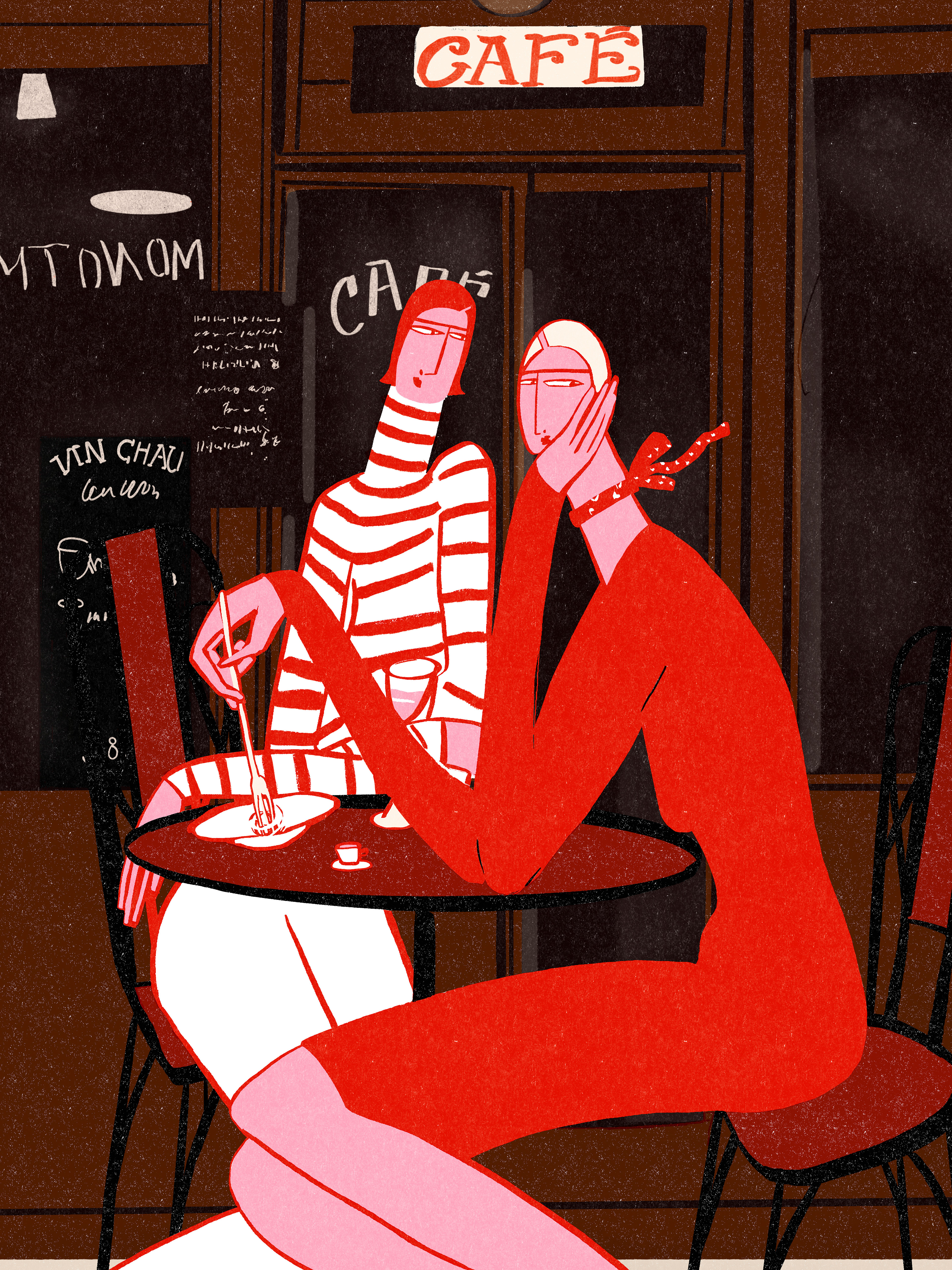 Timeless elegance with a hint of boredom. Two women, impossibly long-legged, linger over pasta and wine at the iconic Le Consulat café in Paris. A moment of effortless chic, captured in line and color.