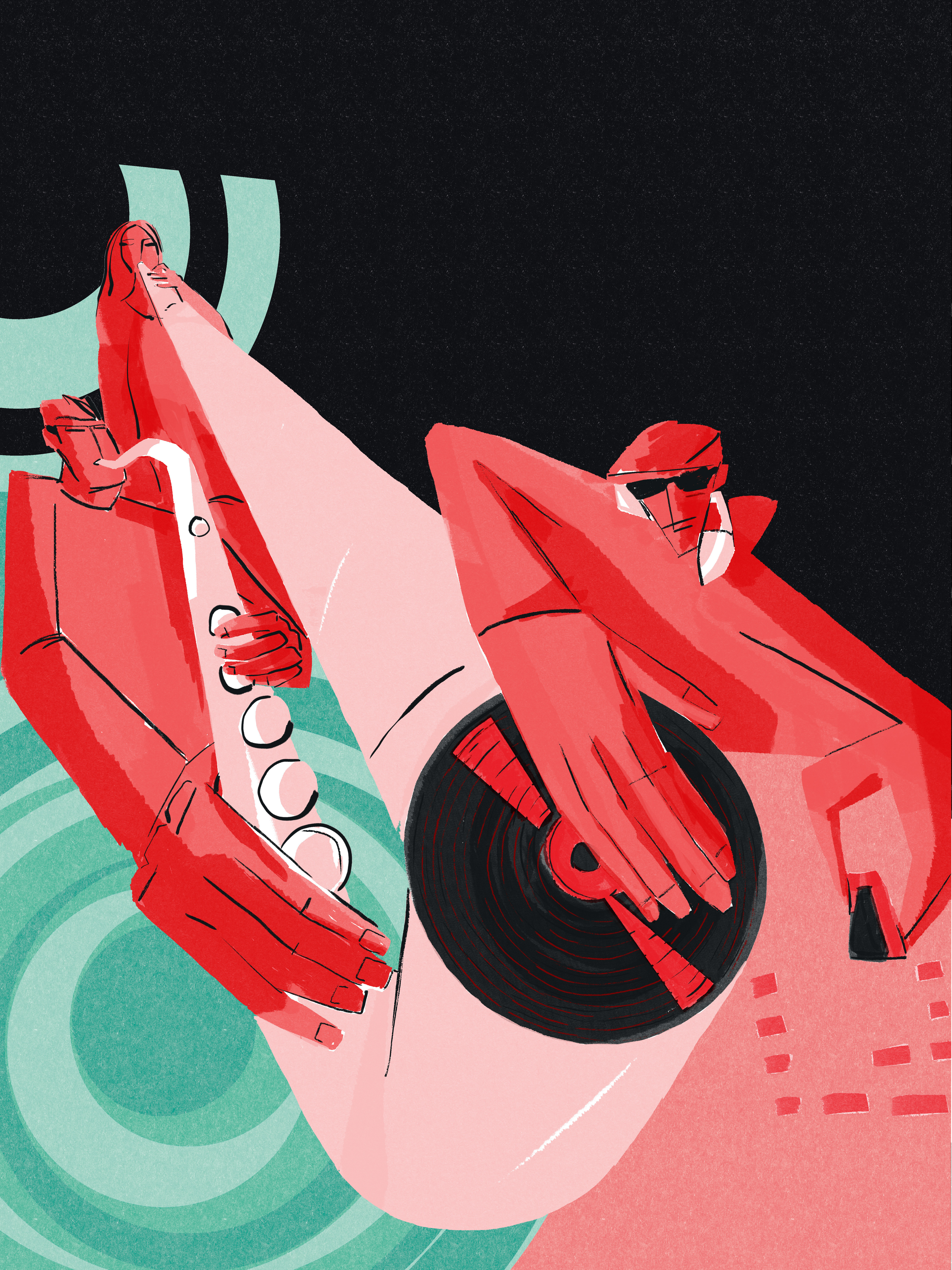 Illustration for a band that blends the sounds of saxophone, didgeridoo, and house beats. The fusion of organic and electronic music is also reflected visually – rhythmic, vibrant, and modern. This artwork is used as a flyer and poster for their events.