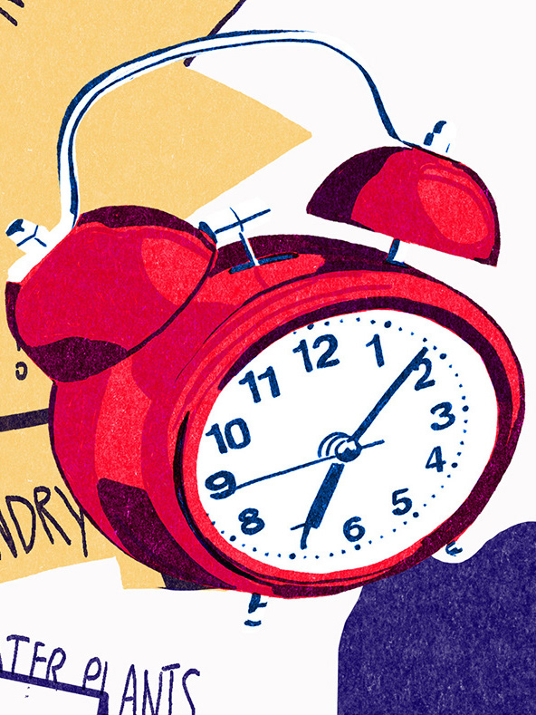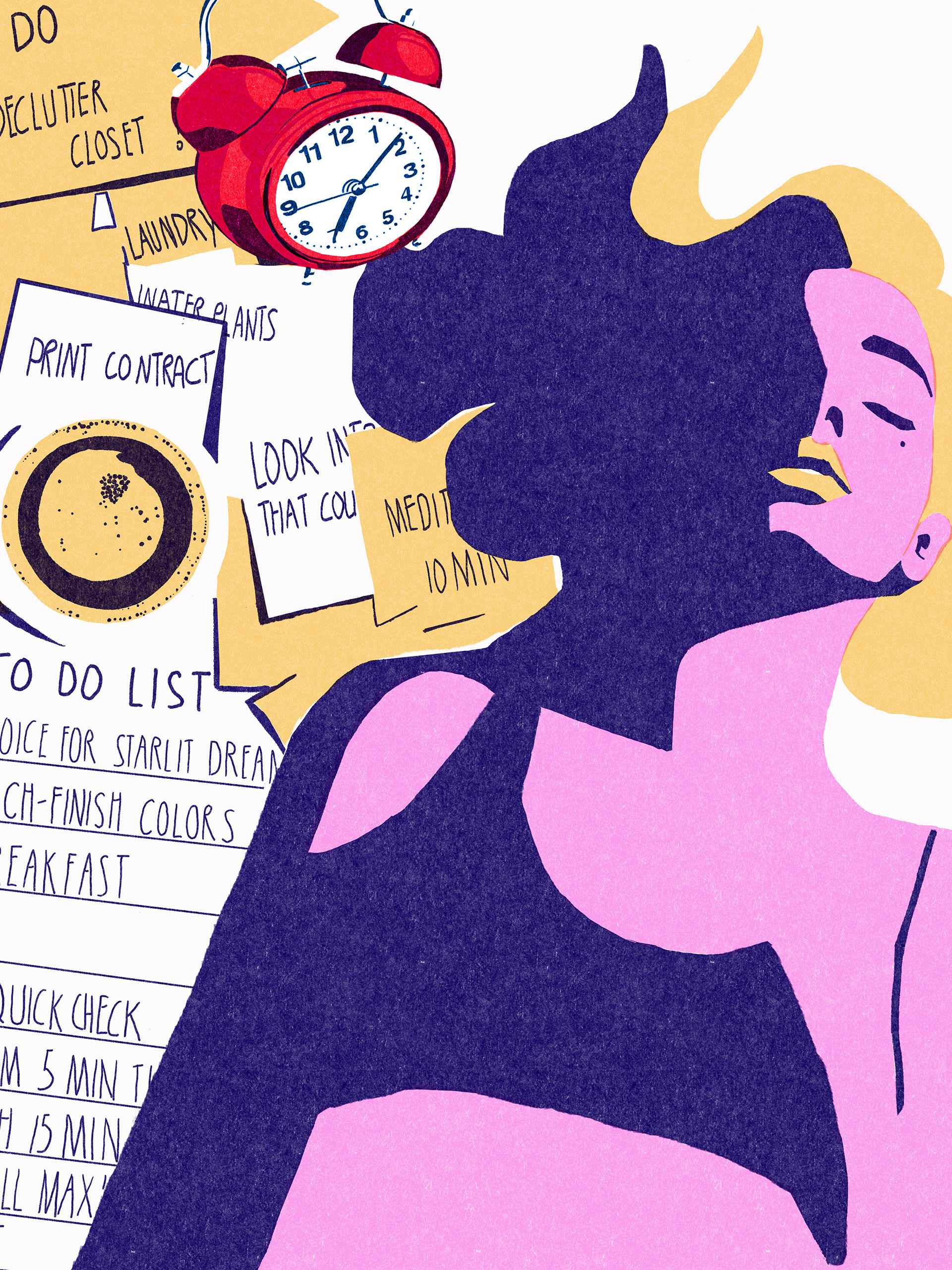 Buried under a chaotic sea of to-do lists and sticky notes, she sleeps undisturbed, while the alarm clock blares. Bold colors and comic-style lines capture the clash between ambition and procrastination, inspired by the iconic style of Roy Lichtenstein.