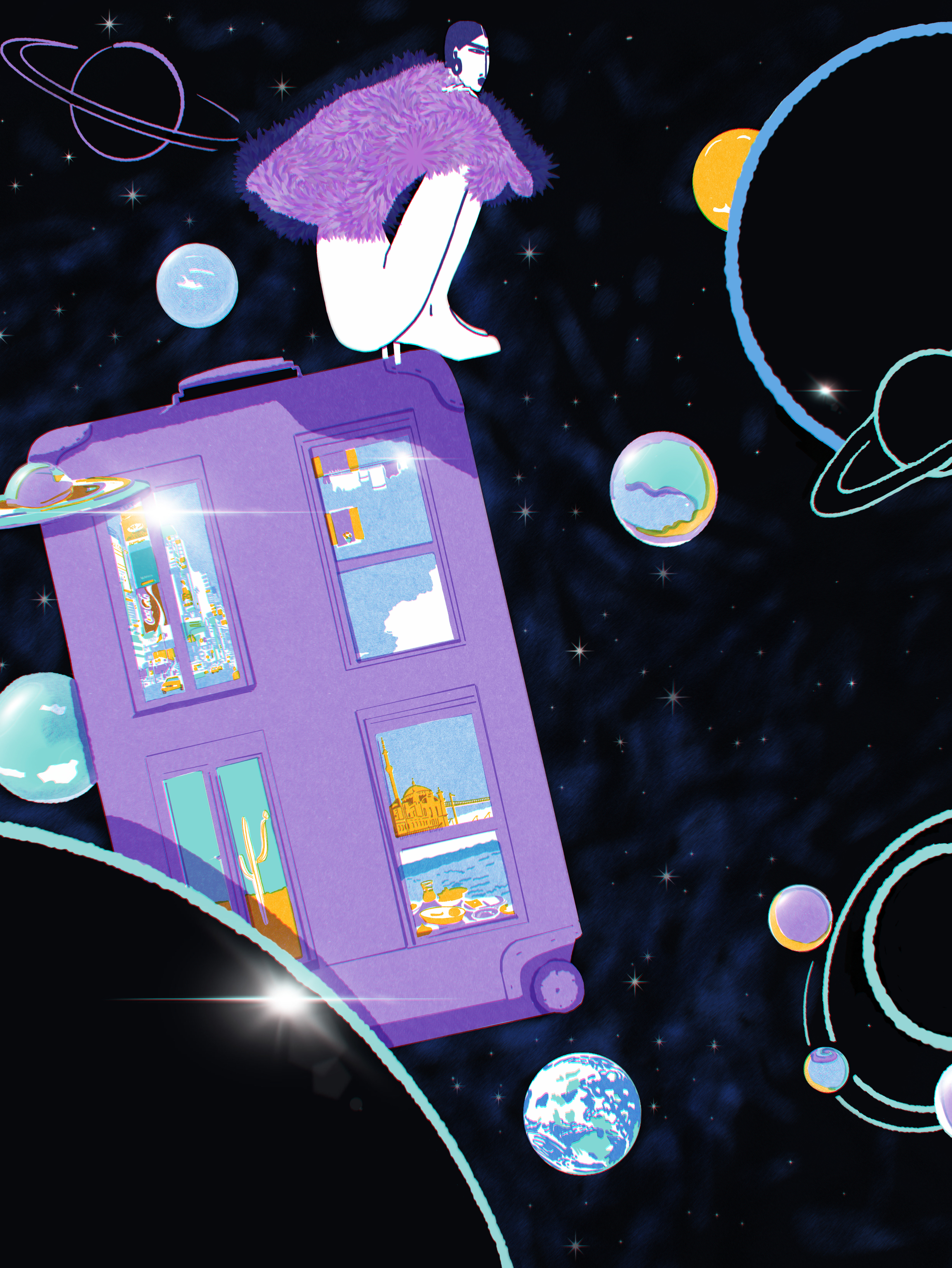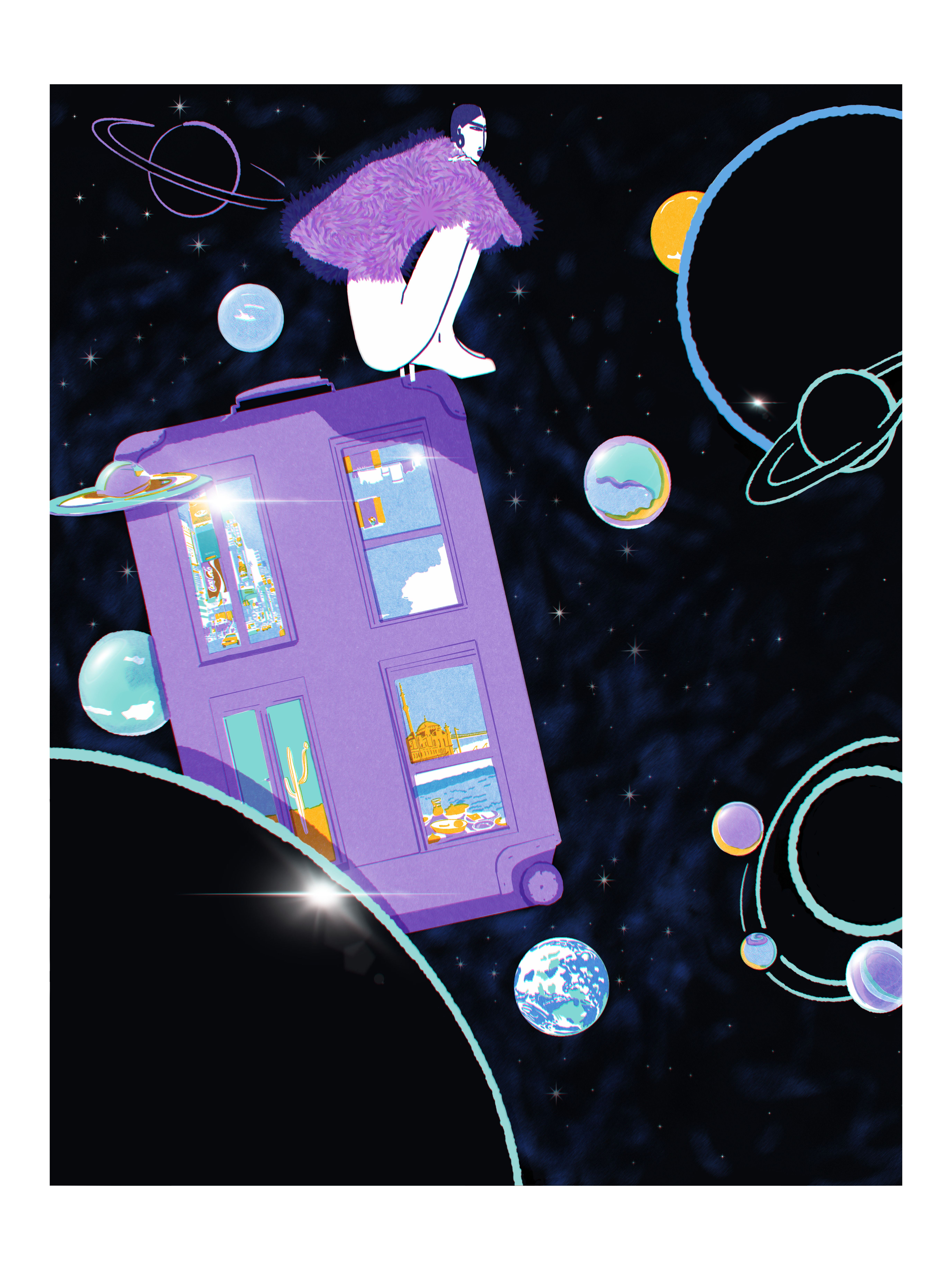 A figure travels through an imagined cosmic space, carried by a suitcase that functions as both vehicle and interior.