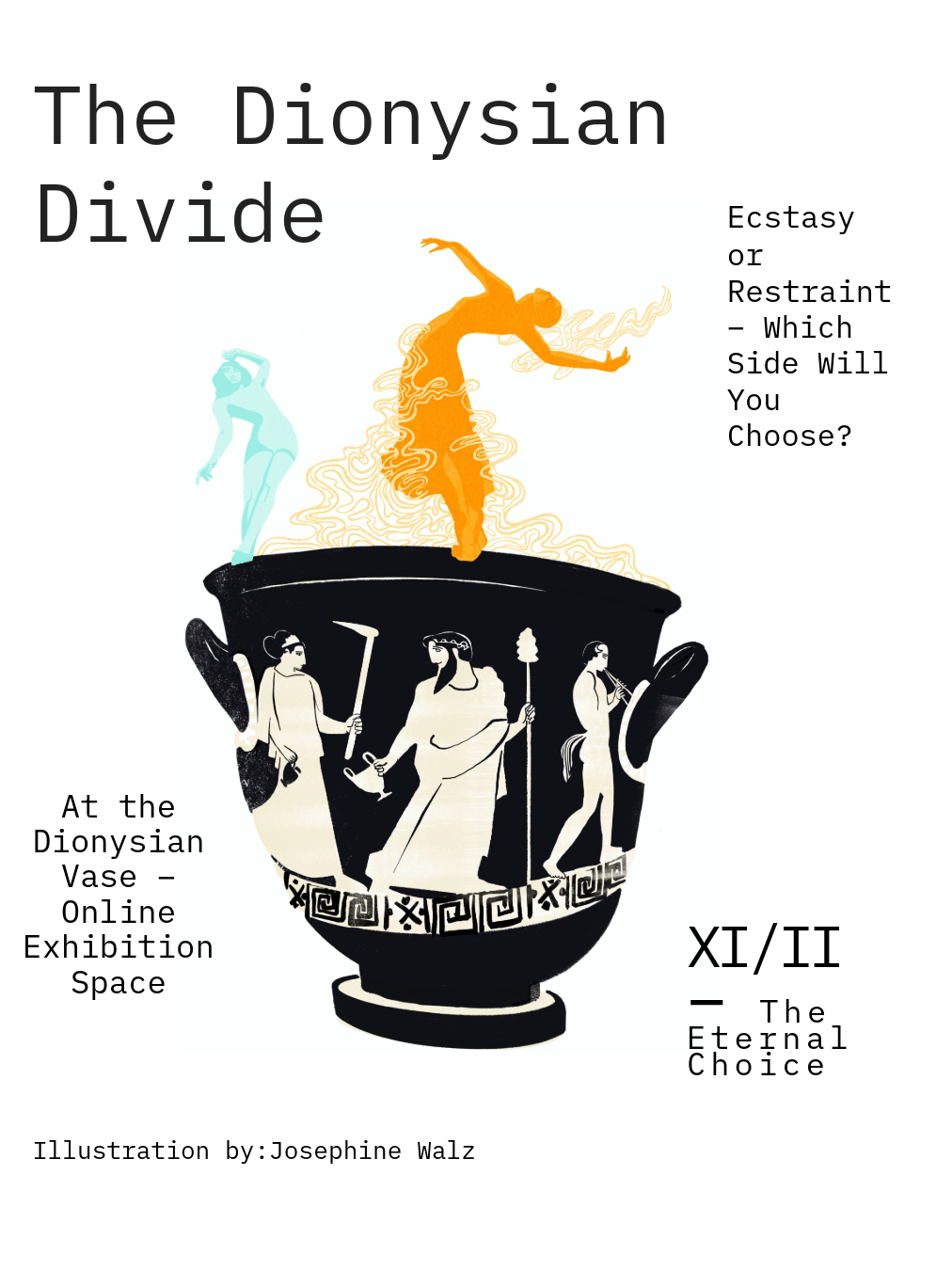 “The Dionysian Divide” explores the tension between ecstasy and restraint, inspired by Greek vase painting.