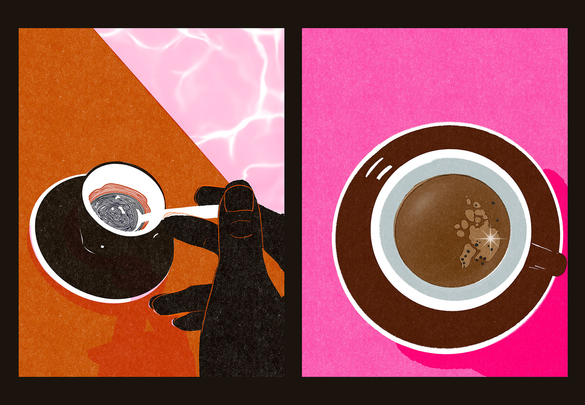 Minimal, refined, and conceptual — these illustrations explore coffee, light, and form through a clean and modern visual language. Subtle animation and sophisticated color use create a warm, stylish atmosphere.