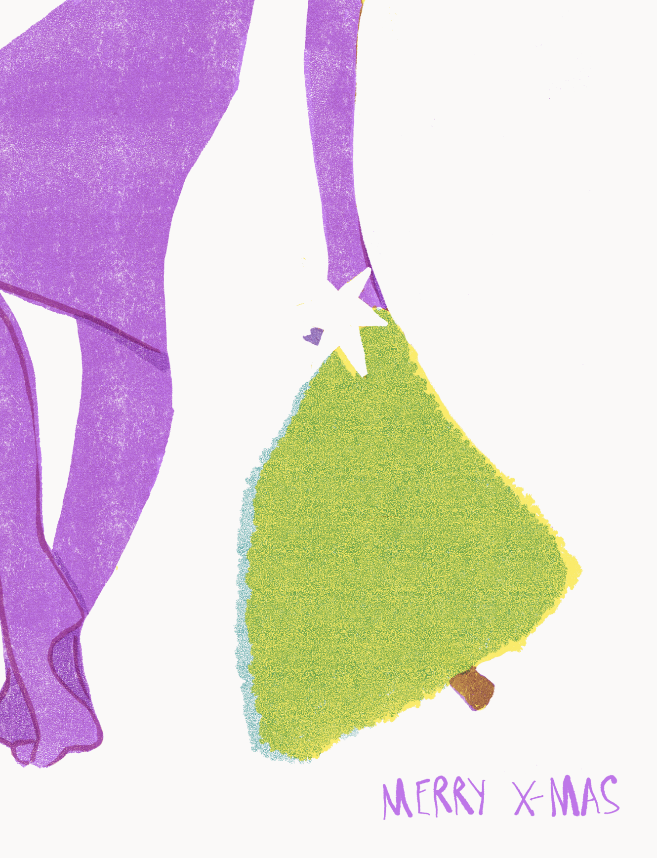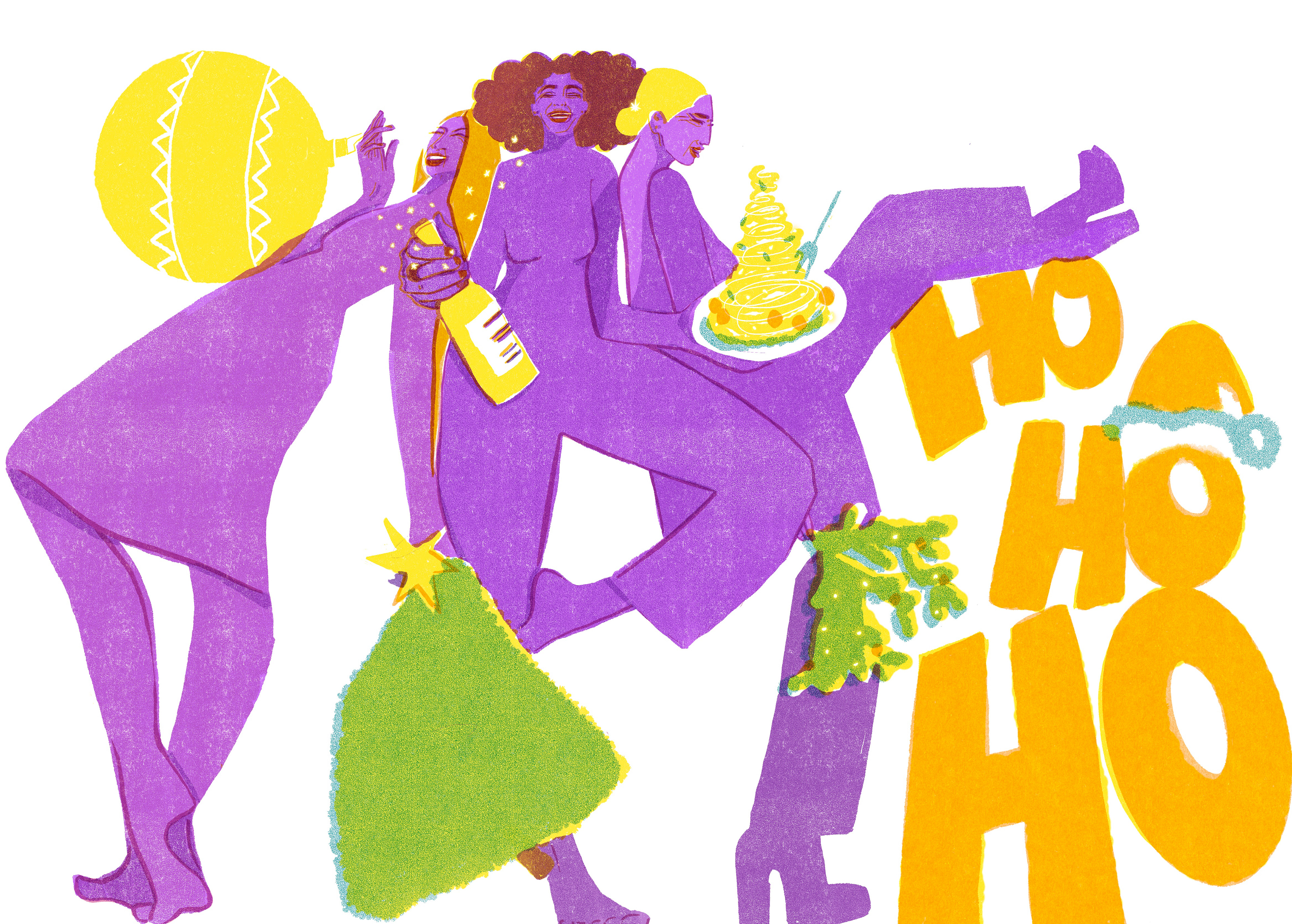 Cette série d'illustrations est une approche moderne et décomplexée de la célébration des Fêtes. Elle capture le chaos joyeux de la saison grâce à des silhouettes audacieuses et une palette de couleurs saturées (mauve et jaune). Le grain texturé ajoute une qualité tactile unique à la scène.