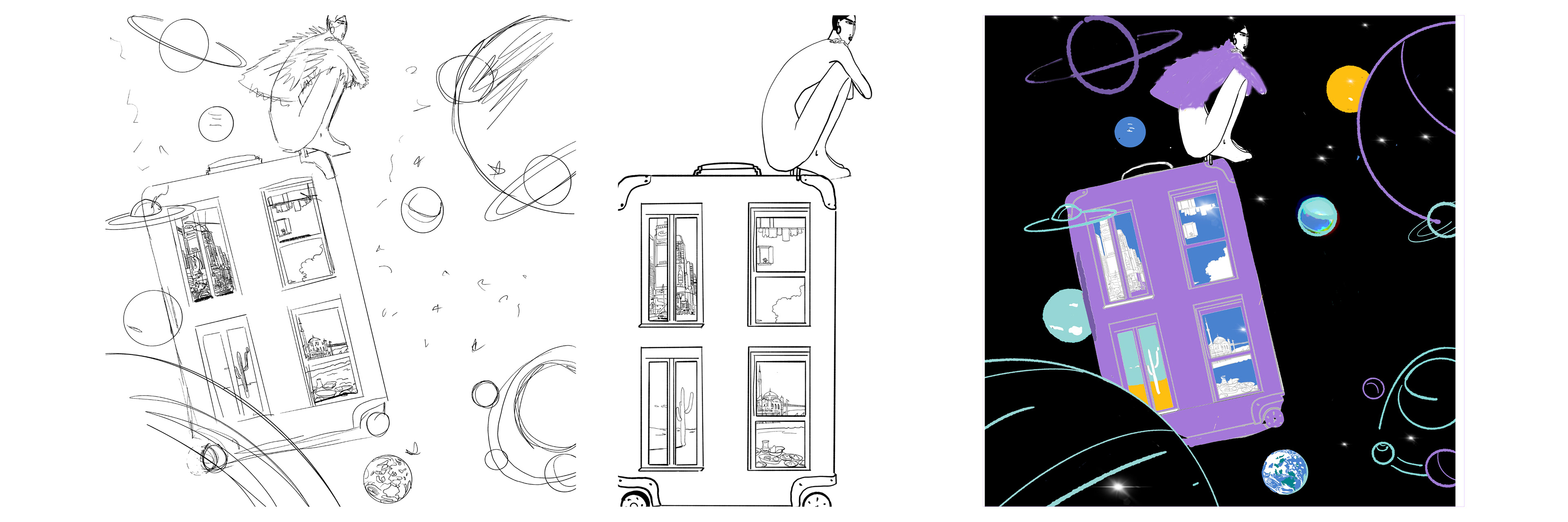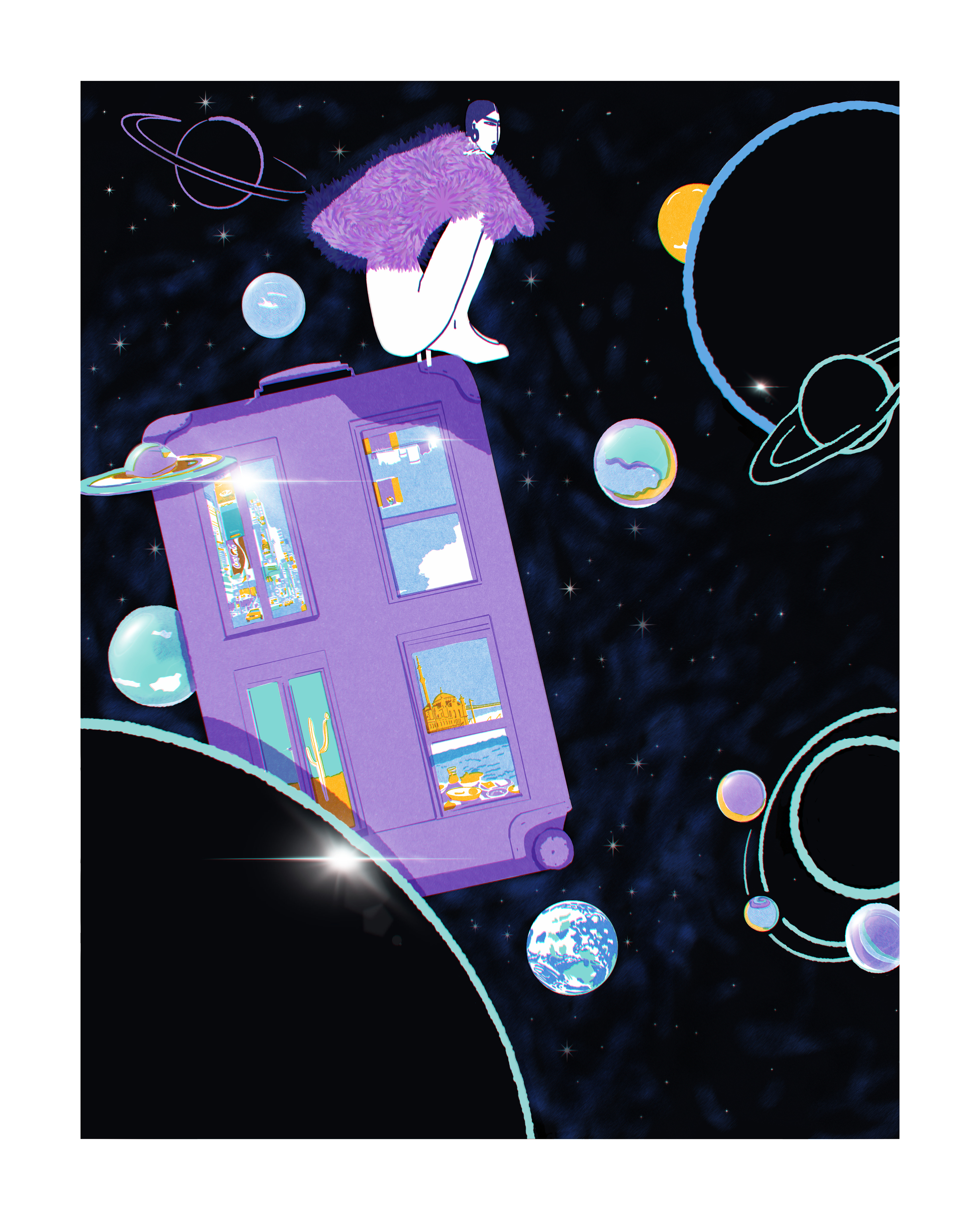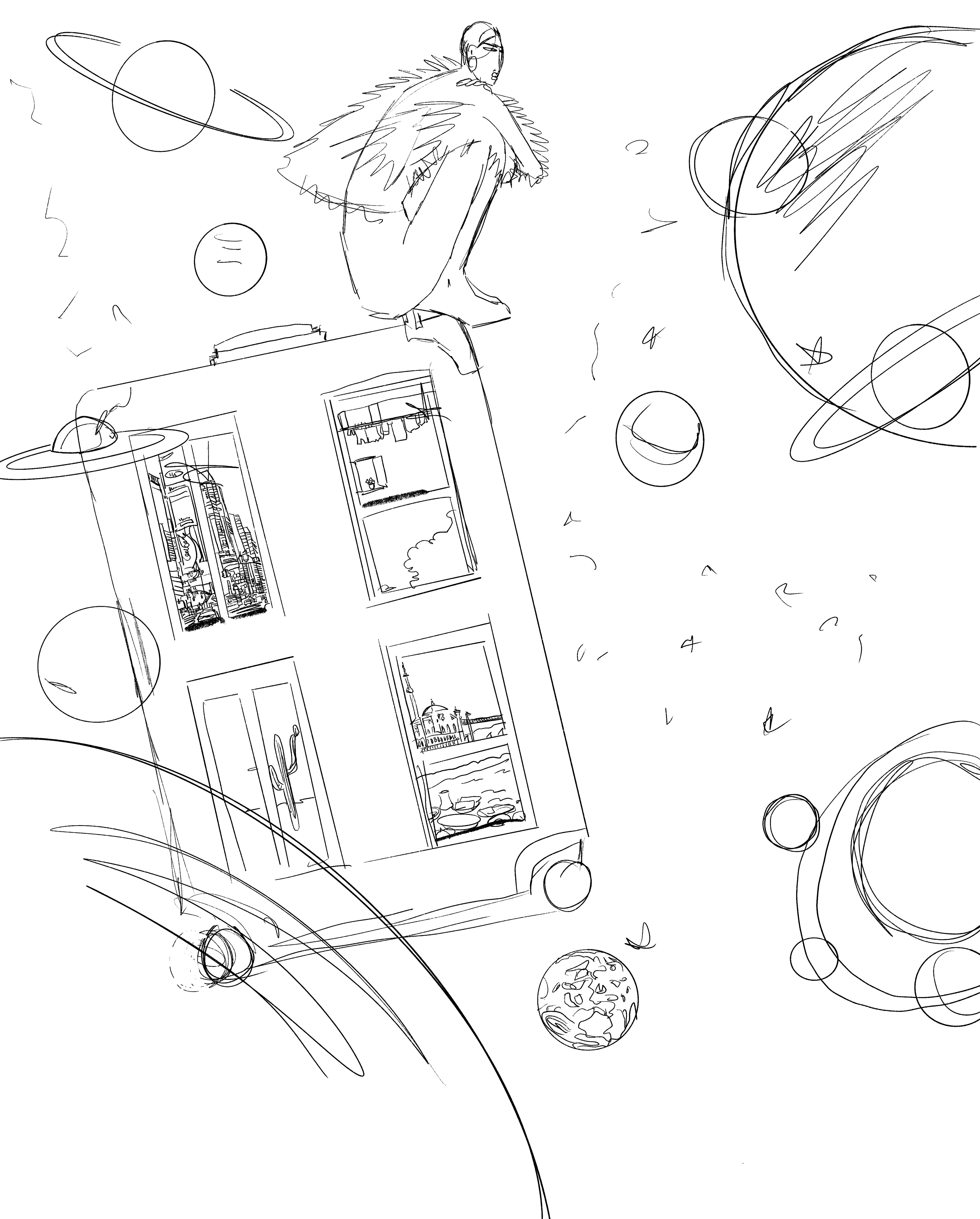 Custom brush work and risograph-inspired textures were used to introduce tactility and an archival quality, contrasting the vastness of the imagined space.