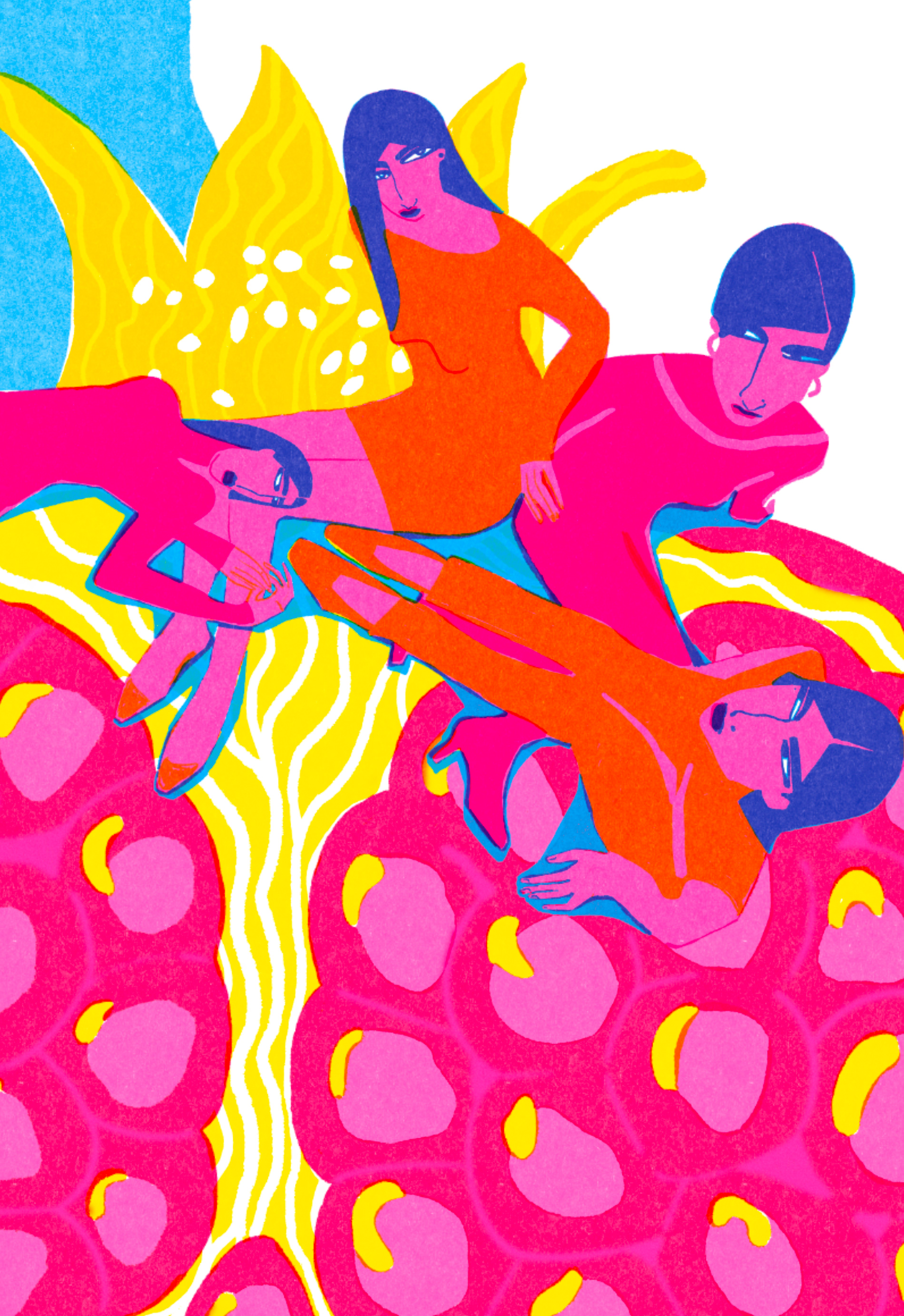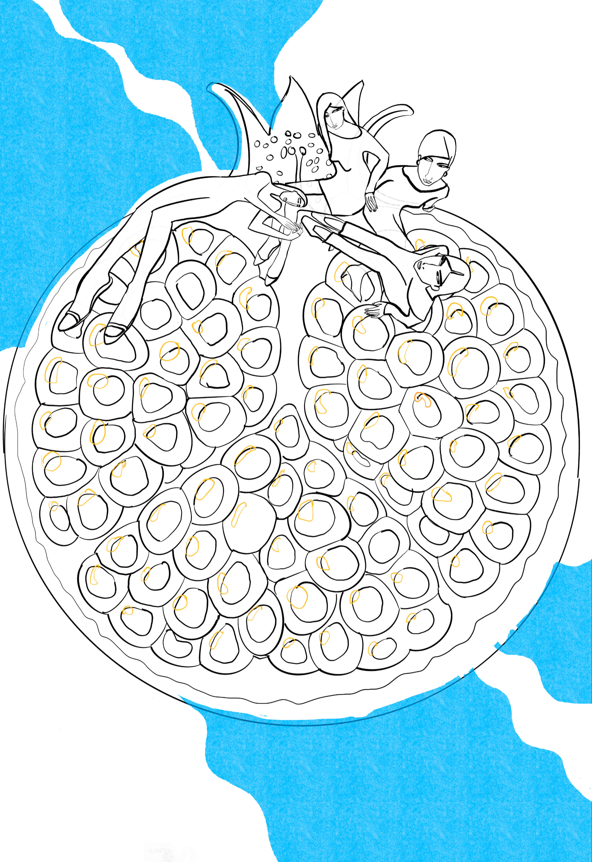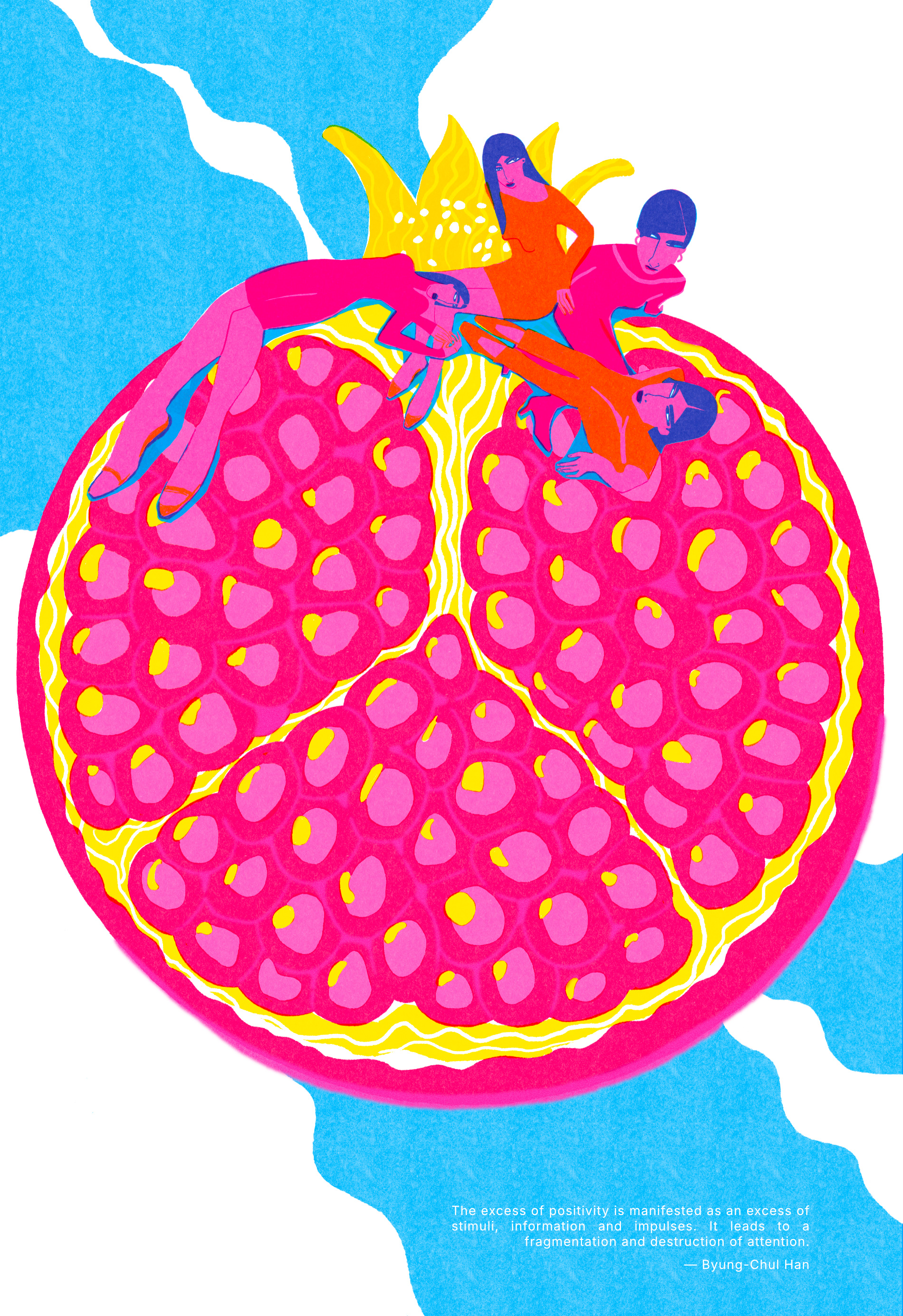 Visualize overstimulation in a single image: a pomegranate becomes a landscape of scattered, weightless figures — calm, yet detached. Abundance turns overwhelming. This conceptual illustration is a metaphor for modern attention and society, inspired by Byung-Chul Han.