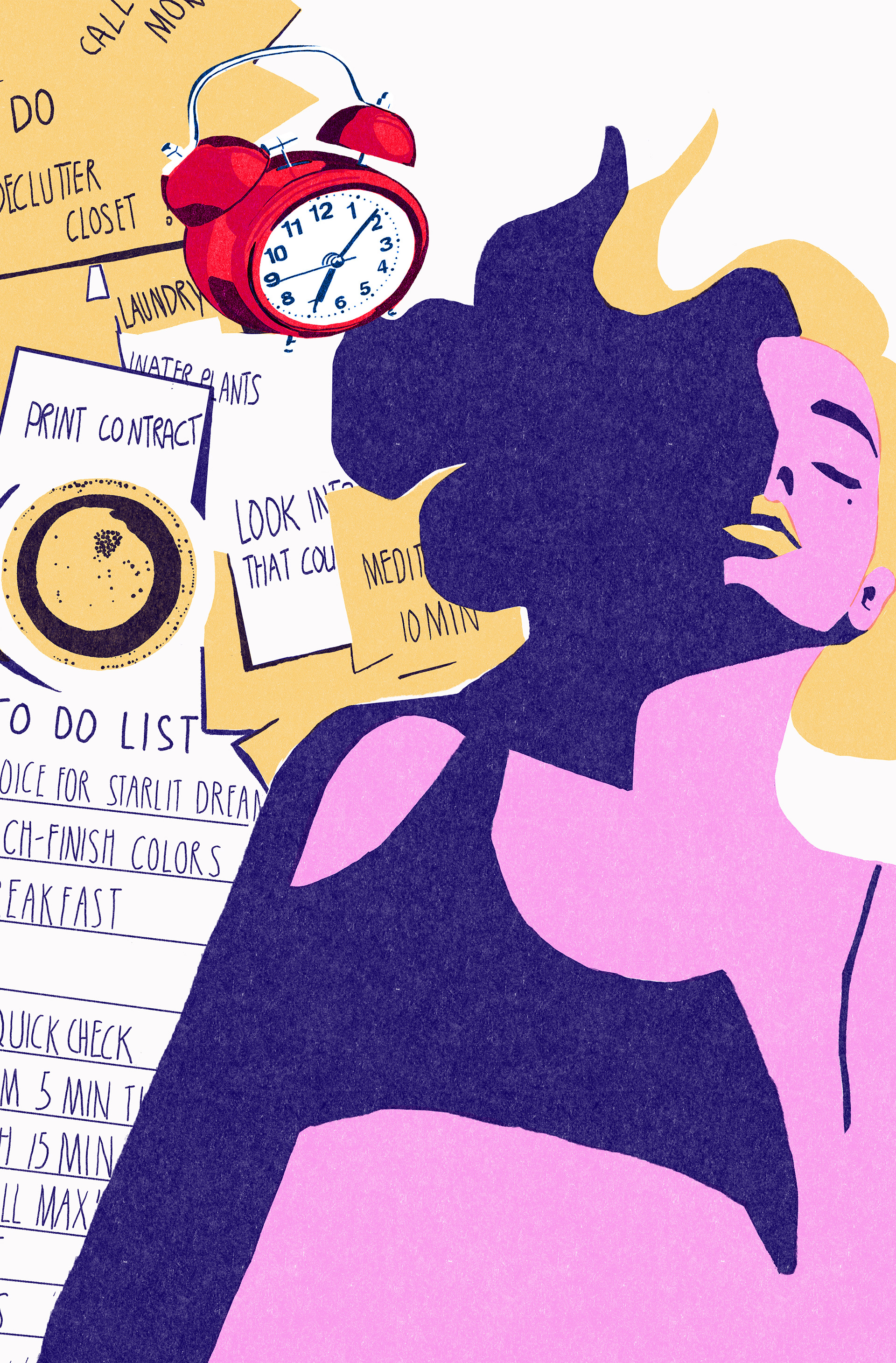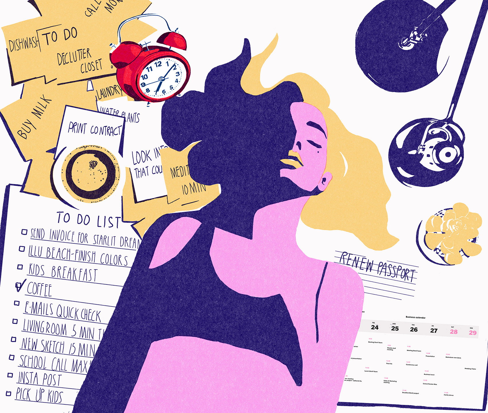 Stil & Emotion Executed in a powerful, high-contrast, limited colour palette. The bold composition emphasizes the tension between the self (duality) and external pressures (to-do lists, time).