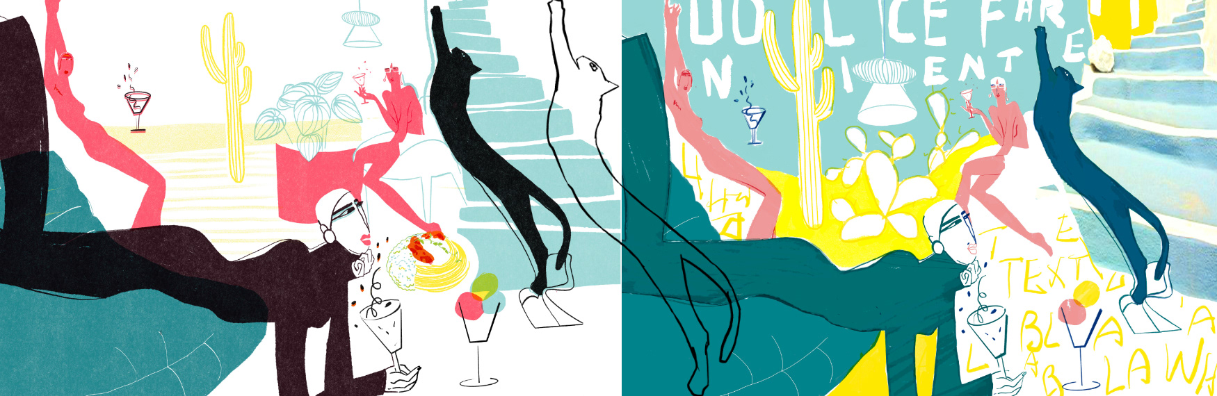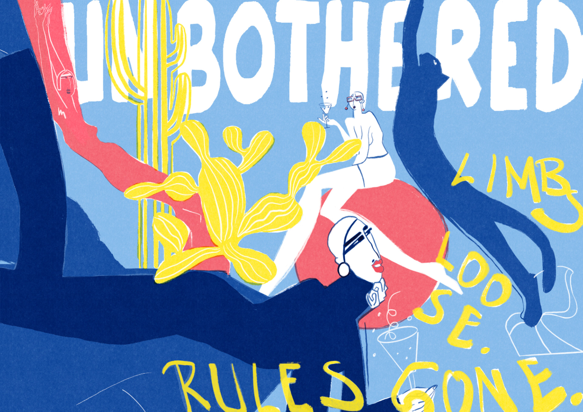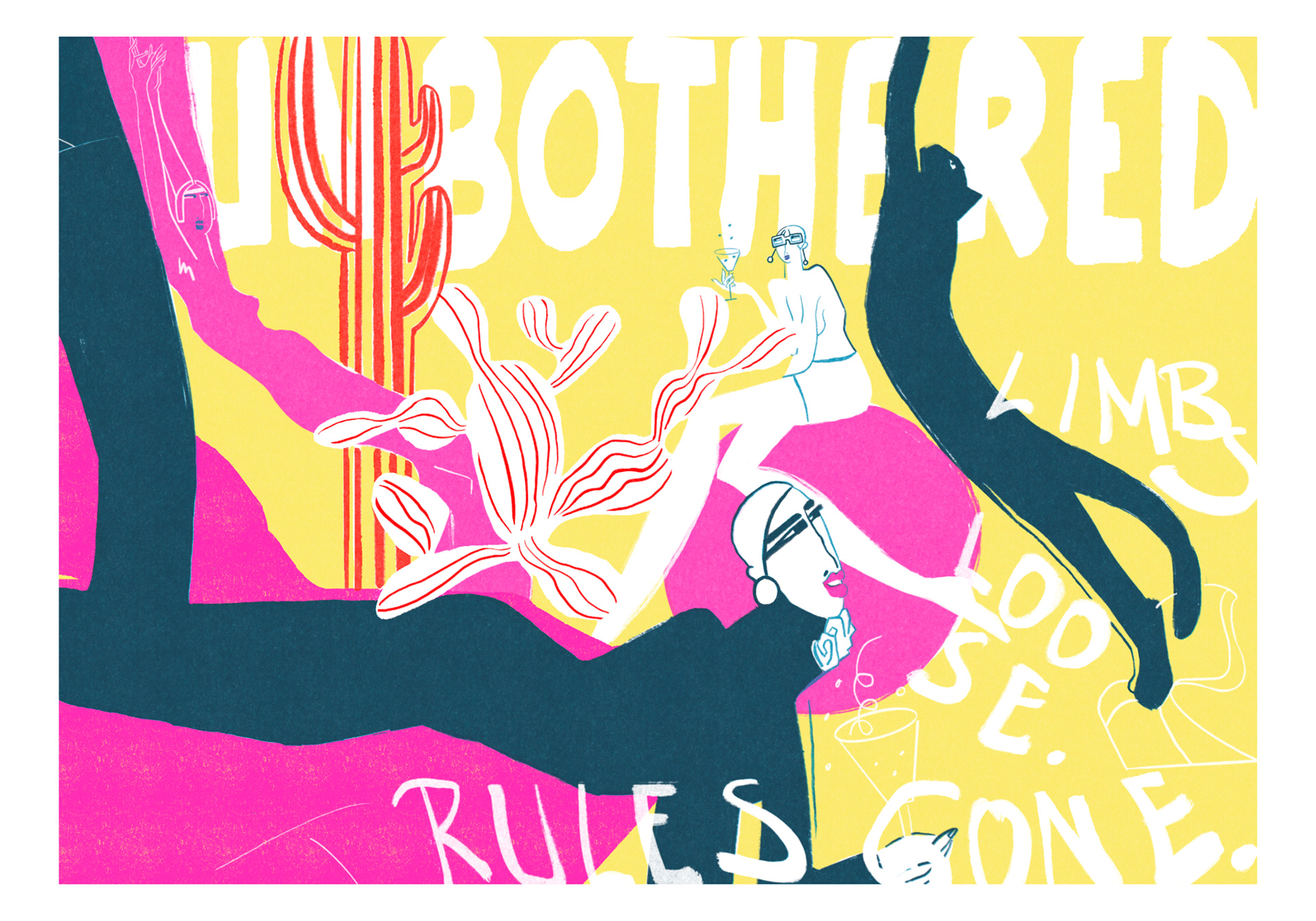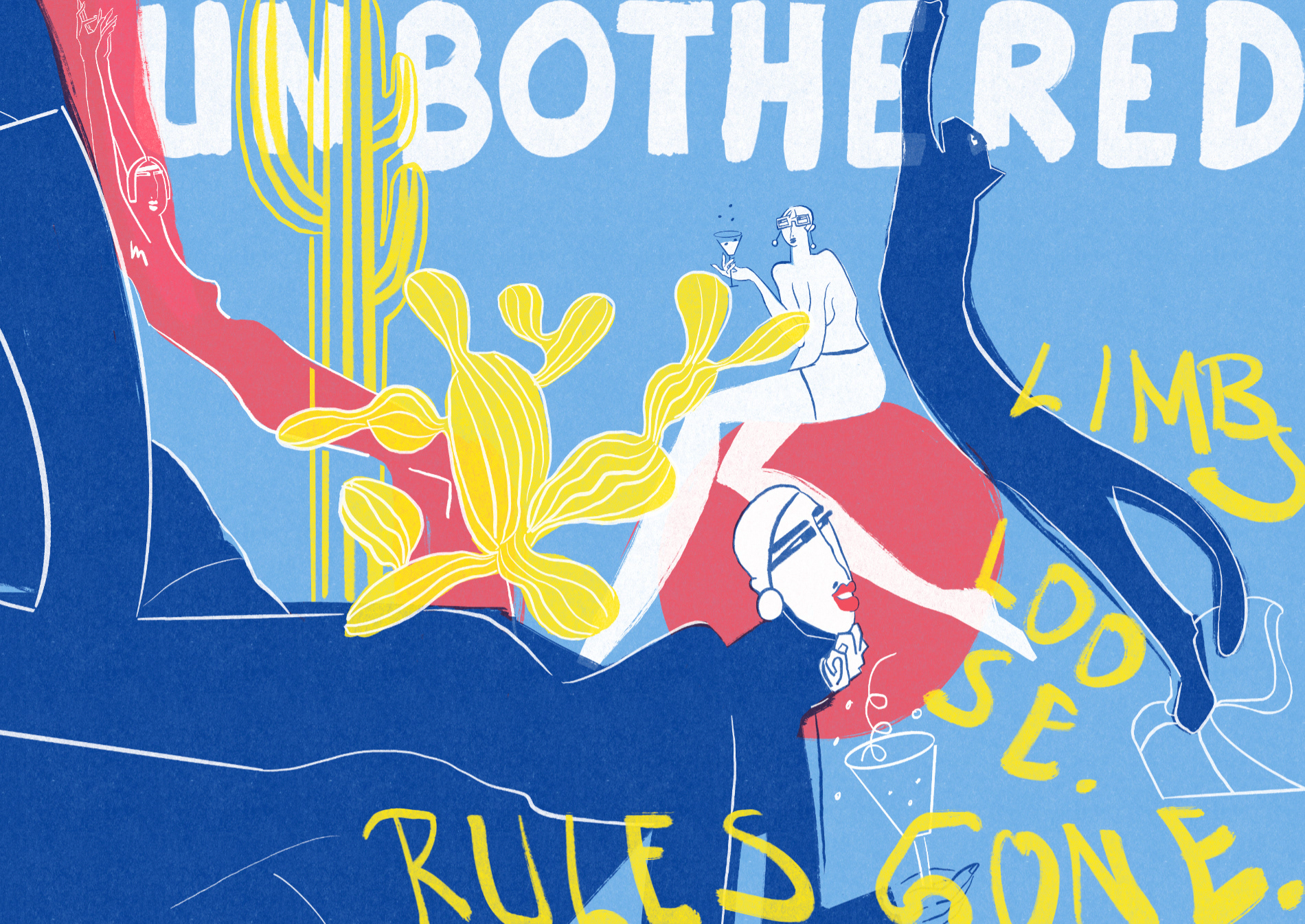 A modern illustration exploring leisure, detachment, and the quiet luxury of doing nothing. Bold colors, sharp lines, and surreal body language.
